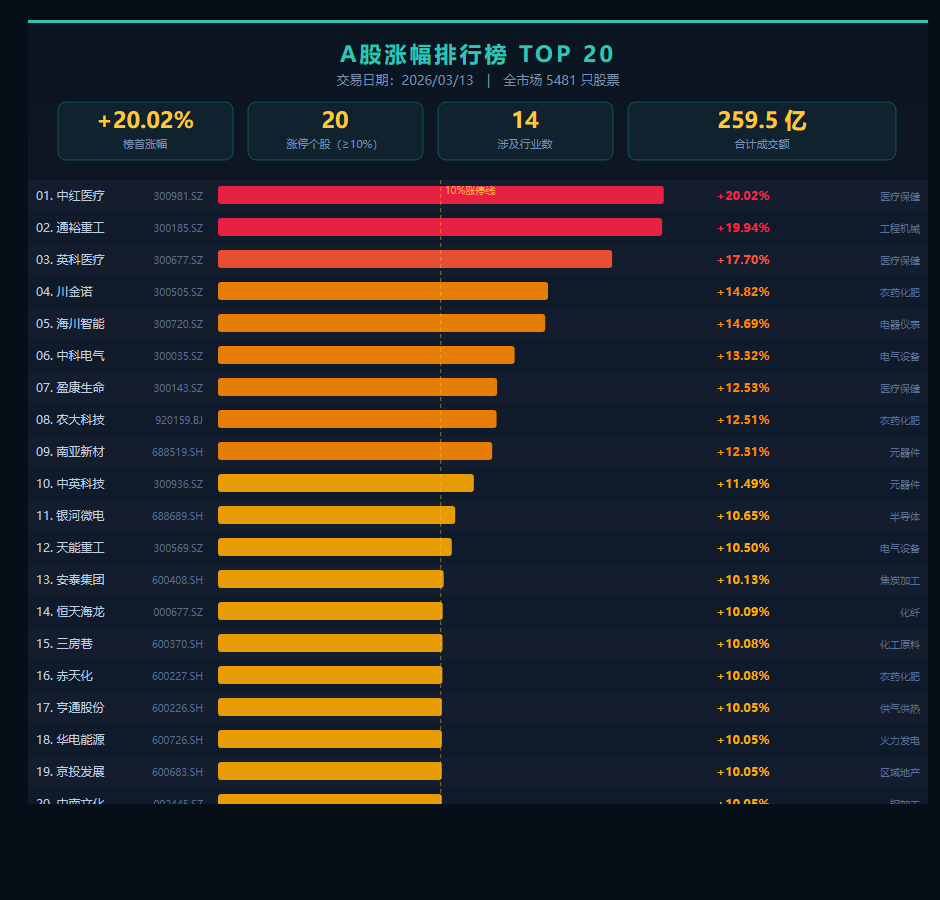 show_reference_line: 在指定值处绘制垂直参考线(如涨停线10%)reference_label: 参考线标签max_value_override: 手动指定 X 轴最大值bar_threshold_colors: 按阈值分色,格式[(20, "#FF2244"), (10, "#FFAA00")]